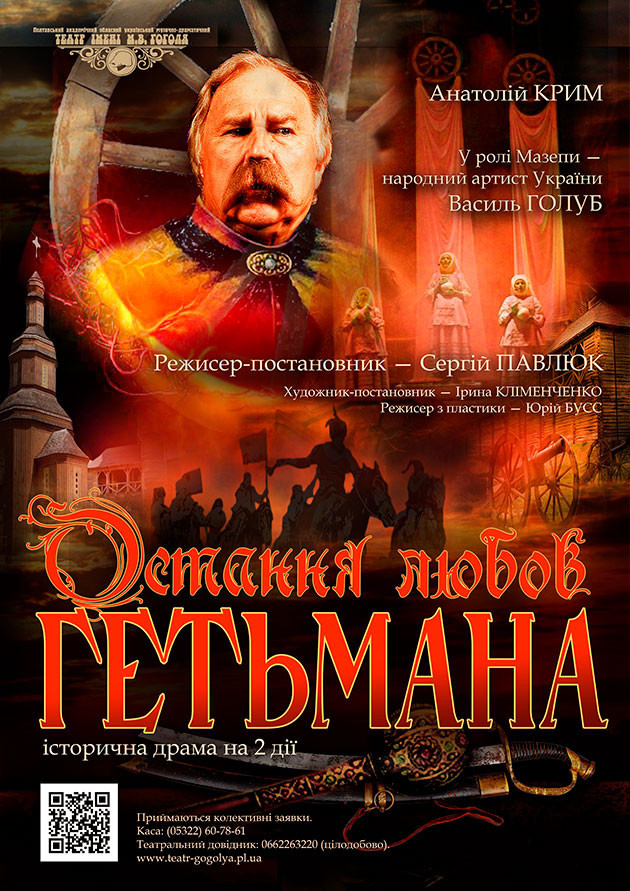 «Остання любов Гетьмана» — першопрочитання п’єси Анатолія Крима, де «ожила» історія про видатного Івана Мазепу, про людей, які його оточували, звичаї, що трималися за часів його гетьманства, про його любов до Мотрі… та до України. Але, в першу чергу, — це розповідь про особистість — про його вчинки, його пріоритети, його сумніви, його кохання та каяття…