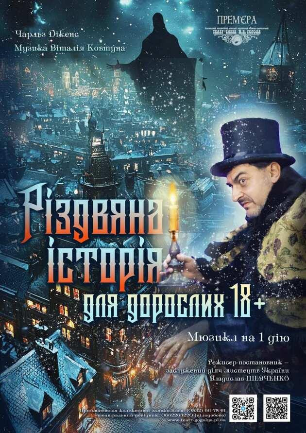 У музичній виставі від театру ім.М.Гоголя "Різдвяні історії для дорослих 18+" за повістю Ч.Дікенса скнара Ебенезер Скрудж,котрий нестримно прагнув лише збагачення,під дією Духів Різдва прходить через духовні переродження.Гоголівці показують нелегку життєву історію людини,яка поступово усвідомлює згубність своїх вчинків і вирішує змінитися. Творити добро,допомогати людям-чи не таким є сенс життя? І чи не на Різдво можливі будь-які добрі дива й справдження будь-яких добрих бажань?Творці мюзиклу переконують,що так і є.